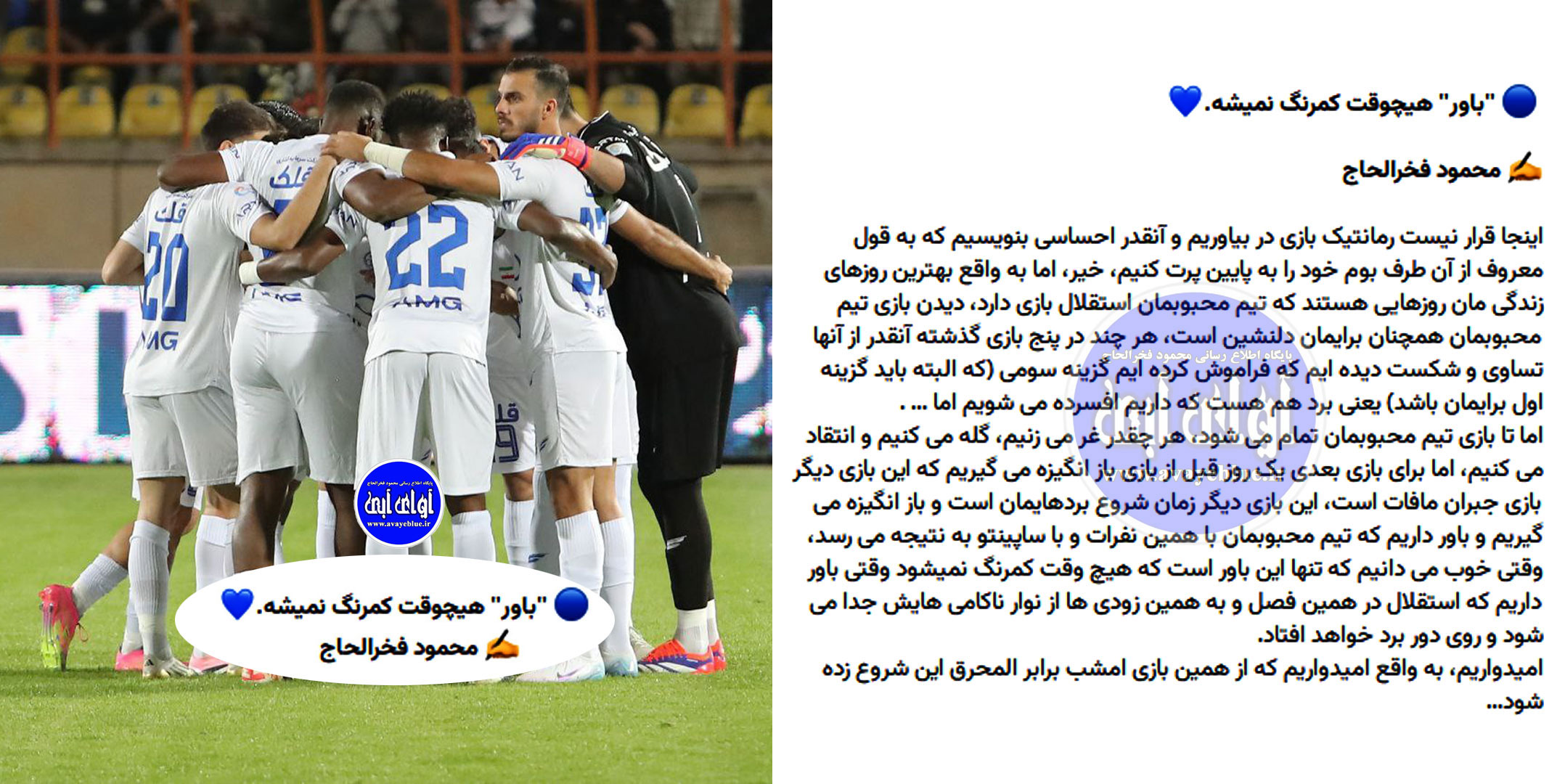 اما تا بازی تیم محبوبمان تمام می شود، هر چقدر غر می زنیم، گله می کنیم و انتقاد می کنیم، اما برای بازی بعدی یک روز قبل از بازی باز انگیزه می گیریم که این بازی دیگر بازی جبران مافات است، این بازی دیگر زمان شروع بردهایمان است و باز انگیزه می گیریم و باور داریم که تیم محبوبمان با همین نفرات و با ساپینتو به نتیجه می رسد، وقتی خوب می دانیم که تنها این باور است که هیچ وقت کمرنگ نمیشود وقتی باور داریم که استقلال در همین فصل و به همین زودی ها از نوار ناکامی هایش جدا می شود و روی دور برد خواهد افتاد.