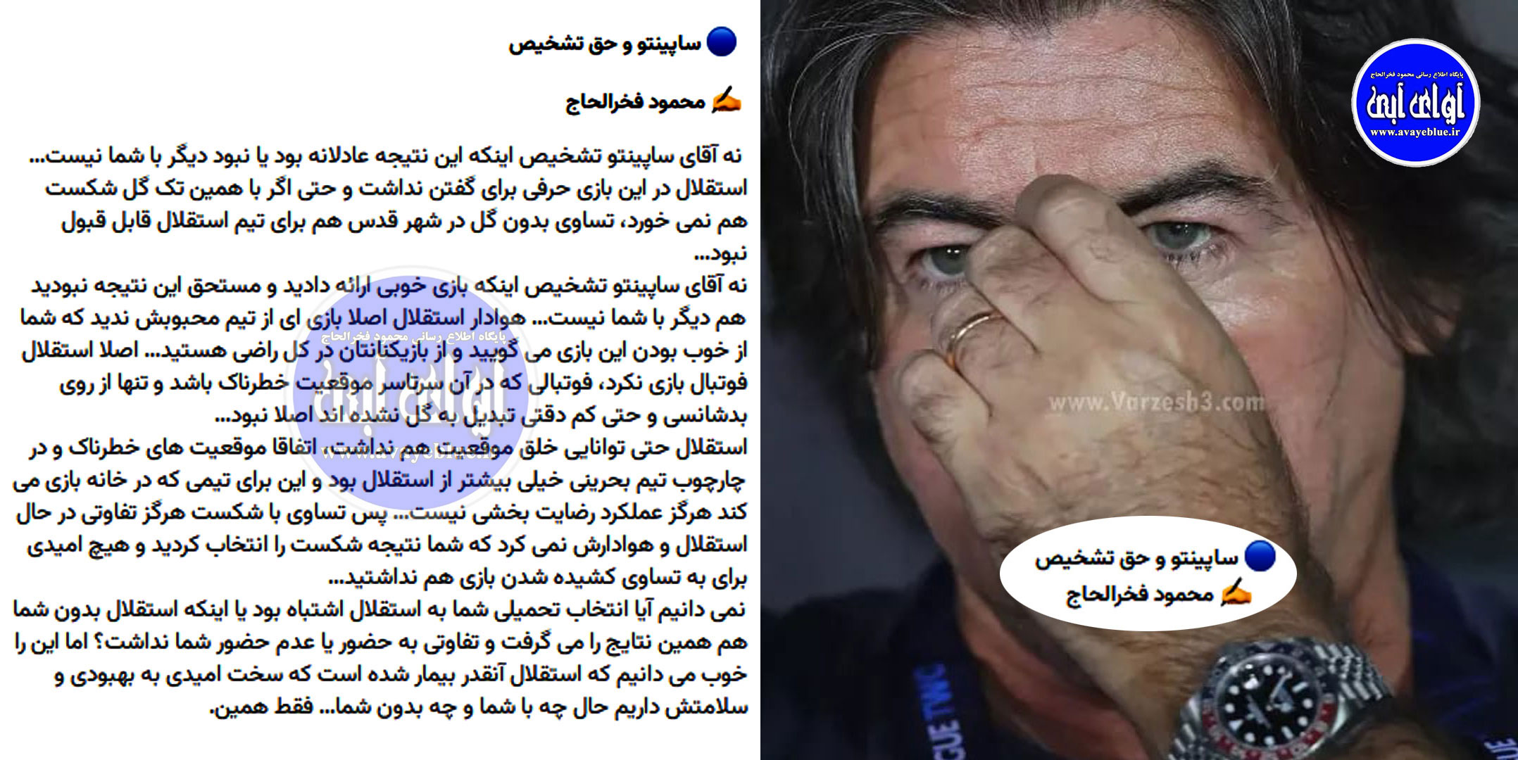 نه آقای ساپینتو تشخیص اینکه بازی خوبی ارائه دادید و مستحق این نتیجه نبودید هم دیگر با شما نیست... هوادار استقلال اصلا بازی ای از تیم محبوبش ندید که شما از خوب بودن این بازی می گویید و از بازیکنانتان در کل راضی هستید... اصلا استقلال فوتبال بازی نکرد، فوتبالی که در آن سرتاسر موقعیت خطرناک باشد و تنها از روی بدشانسی و حتی کم دقتی تبدیل به گل نشده اند اصلا نبود...