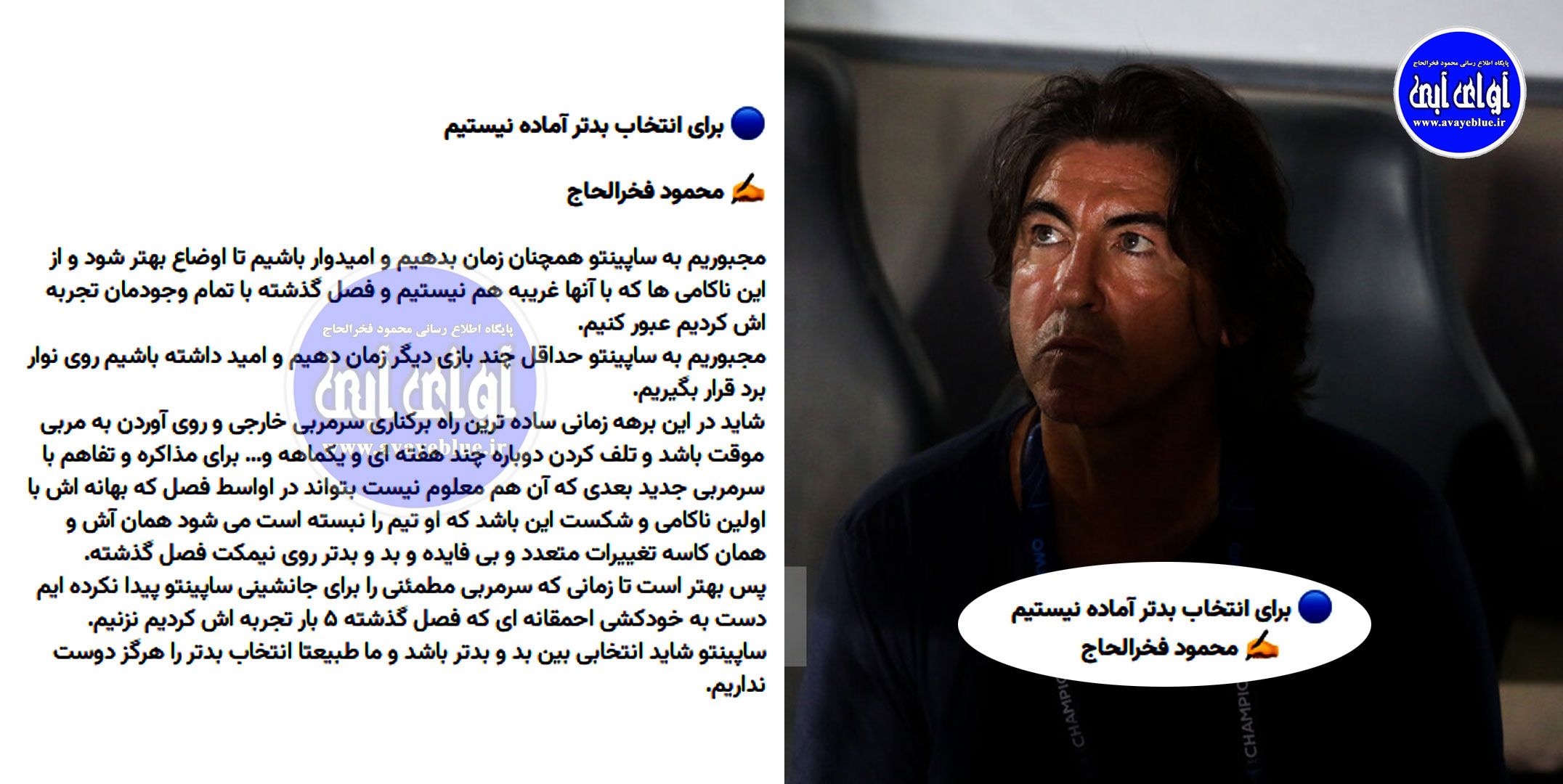 مجبوریم به ساپینتو همچنان زمان بدهیم و امیدوار باشیم تا اوضاع بهتر شود و از این ناکامی ها که با آنها غریبه هم نیستیم و فصل گذشته با تمام وجودمان تجربه اش کردیم عبور کنیم.
