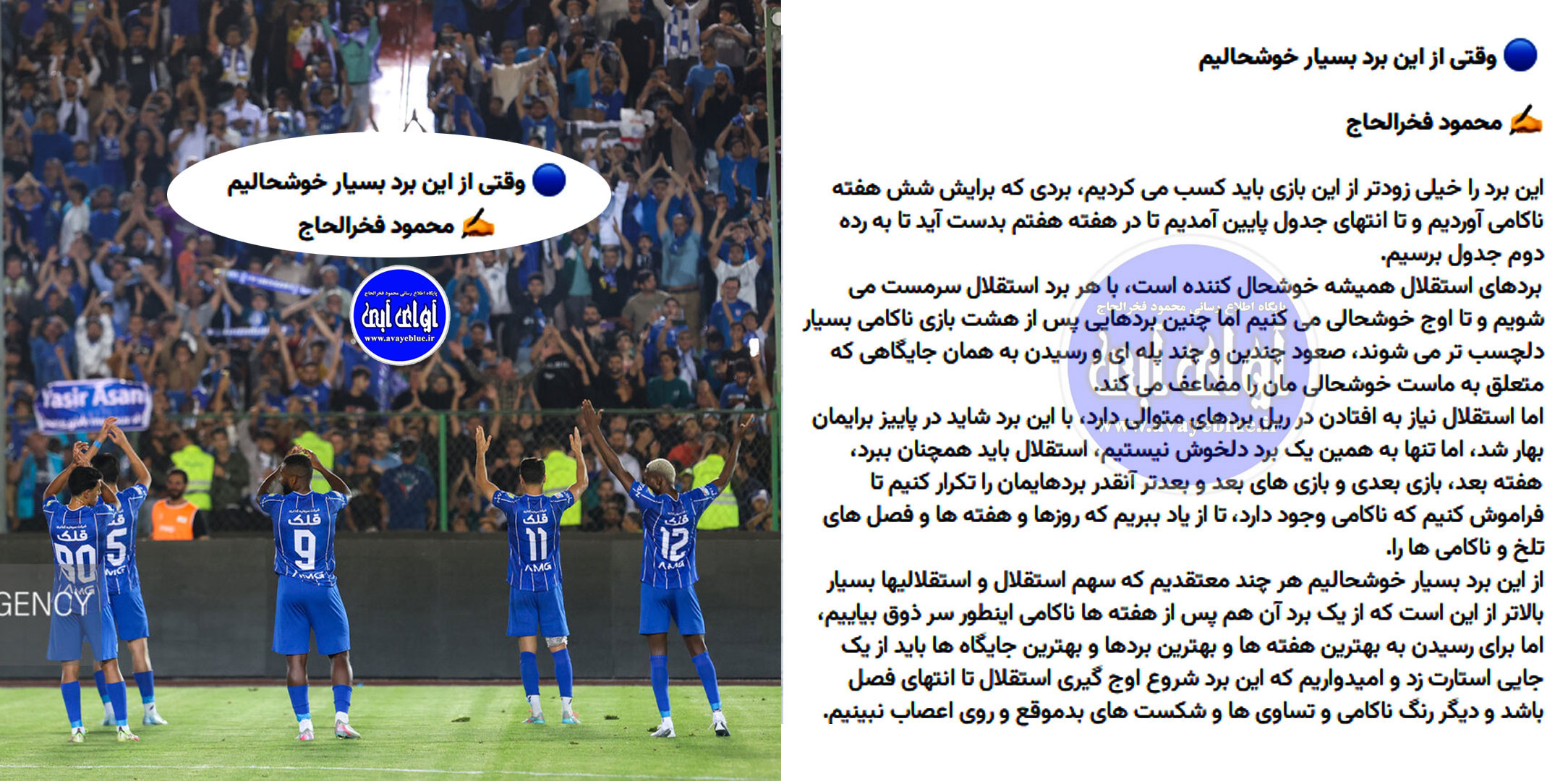 از این برد بسیار خوشحالیم هر چند معتقدیم که سهم استقلال و استقلالیها بسیار بالاتر از این است که از یک برد آن هم پس از هفته ها ناکامی اینطور سر ذوق بیاییم، اما برای رسیدن به بهترین هفته ها و بهترین بردها و بهترین جایگاه ها باید از یک جایی استارت زد و امیدواریم که این برد شروع اوج گیری استقلال تا انتهای فصل باشد و دیگر رنگ ناکامی و تساوی ها و شکست های بدموقع و روی اعصاب نبینیم.