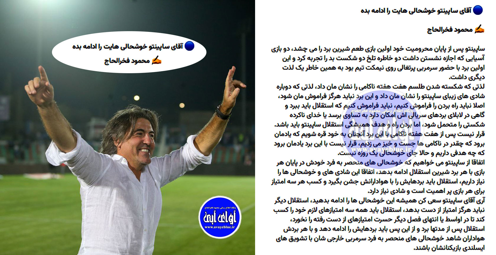 آری آقای ساپینتو سعی کن همیشه این خوشحالی ها را ادامه بدهید، استقلال دیگر نباید هرگز امتیاز از دست بدهد، استقلال باید همه سه امتیازهای لازم خود را کسب کند تا در اواسط یا انتهای فصل دیگر حسرت امتیازهای از دست رفته را نخورد، استقلال پس از مدتها برد و از این پس باید بردهایش را ادامه دهد و با هر بردش هواداران شاهد خوشحالی های منحصر به فرد سرمربی خارجی شان با تشویق های ایسلندی بازیکنانشان باشند.