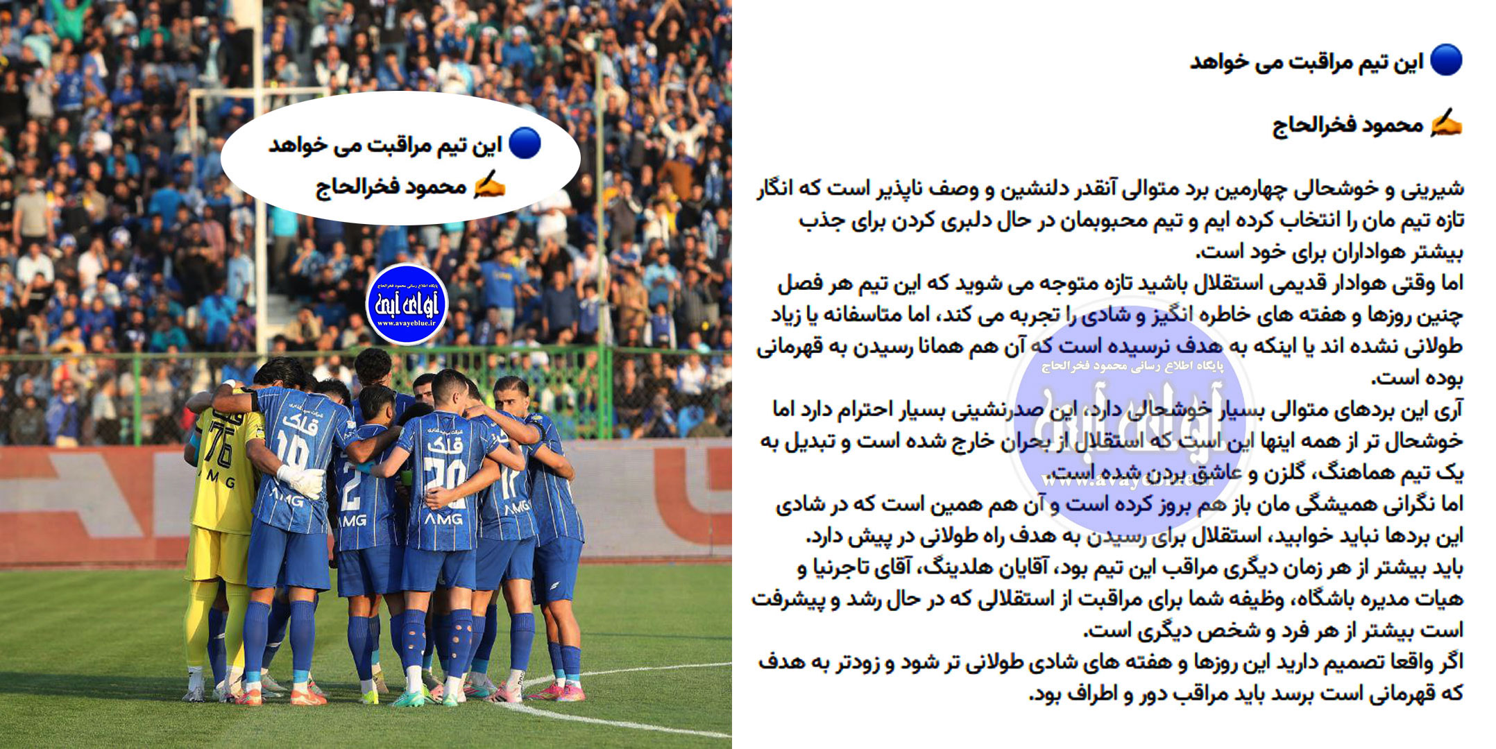 باید بیشتر از هر زمان دیگری مراقب این تیم بود، آقایان هلدینگ، آقای تاجرنیا و هیات مدیره باشگاه، وظیفه شما برای مراقبت از استقلالی که در حال رشد و پیشرفت است بیشتر از هر فرد و شخص دیگری است.