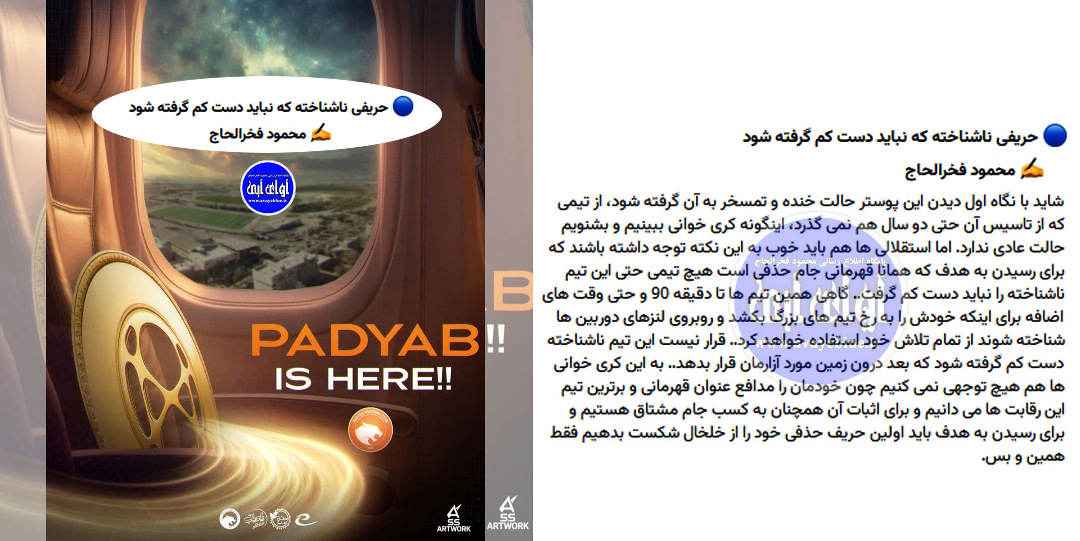 شاید با نگاه اول دیدن این پوستر حالت خنده و تمسخر به آن گرفته شود، از تیمی که از تاسیس آن حتی دو سال هم نمی گذرد، اینگونه کری خوانی ببینیم و بشنویم حالت عادی ندارد. اما استقلالی ها هم باید خوب به این نکته توجه داشته باشند که برای رسیدن به هدف که همانا قهرمانی جام حذفی است هیچ تیمی حتی این تیم ناشناخته را نباید دست کم گرفت.. گاهی همین تیم ها تا دقیقه 90 و حتی وقت های اضافه برای اینکه خودش را به رخ تیم های بزرگ بکشد و روبروی لنزهای دوربین ها شناخته شوند از تمام تلاش خود استفاده خواهد کرد.. قرار نیست این تیم ناشناخته دست کم گرفته شود که بعد درون زمین مورد آزارمان قرار بدهد.. به این کری خوانی ها هم هیچ توجهی نمی کنیم چون خودمان را مدافع عنوان قهرمانی و برترین تیم این رقابت ها می دانیم و برای اثبات آن همچنان به کسب جام مشتاق هستیم و برای رسیدن به هدف باید اولین حریف حذفی خود را از خلخال شکست بدهیم فقط همین و بس.