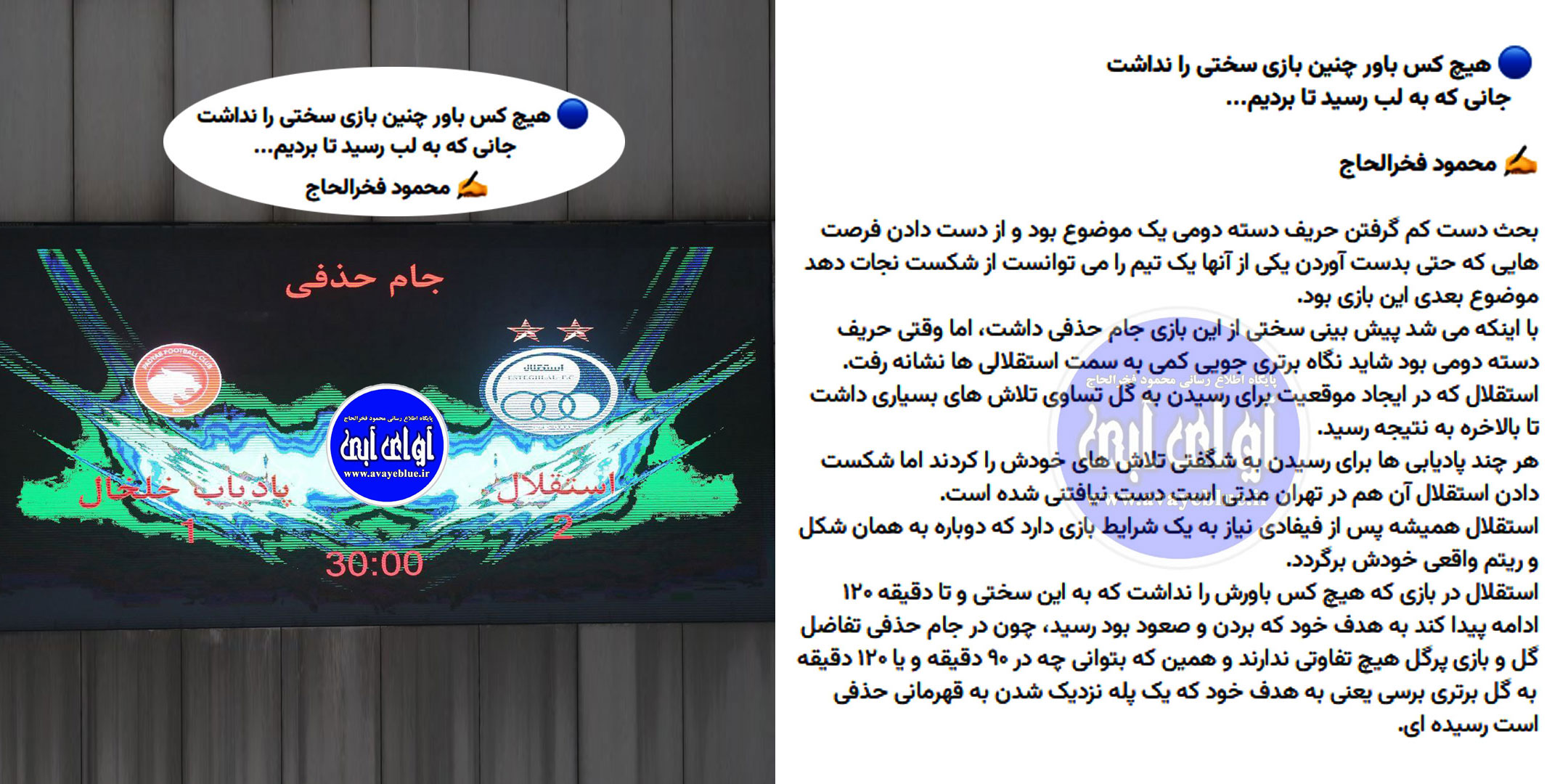 استقلال در بازی که هیچ کس باورش را نداشت که به این سختی و تا دقیقه ۱۲۰ ادامه پیدا کند به هدف خود که بردن و صعود بود رسید، چون در جام حذفی تفاضل گل و بازی پرگل هیچ تفاوتی ندارند و همین که بتوانی چه در ۹۰ دقیقه و یا ۱۲۰ دقیقه به گل برتری برسی یعنی به هدف خود که یک پله نزدیک شدن به قهرمانی حذفی است رسیده ای.