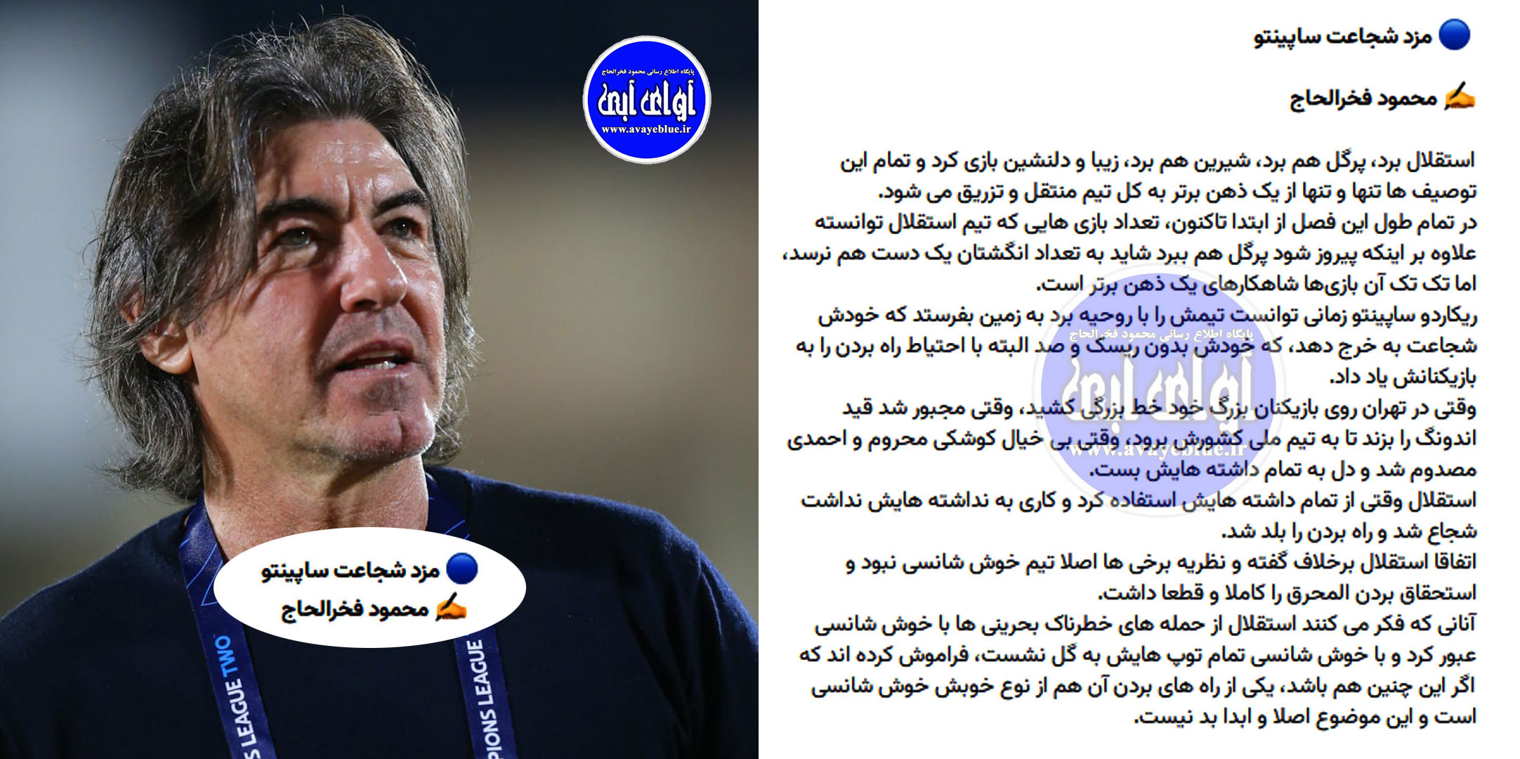 استقلال برد، پرگل هم برد، شیرین هم برد، زیبا و دلنشین بازی کرد و تمام این توصیف ها تنها و تنها از یک ذهن برتر به کل تیم منتقل و تزریق می شود.