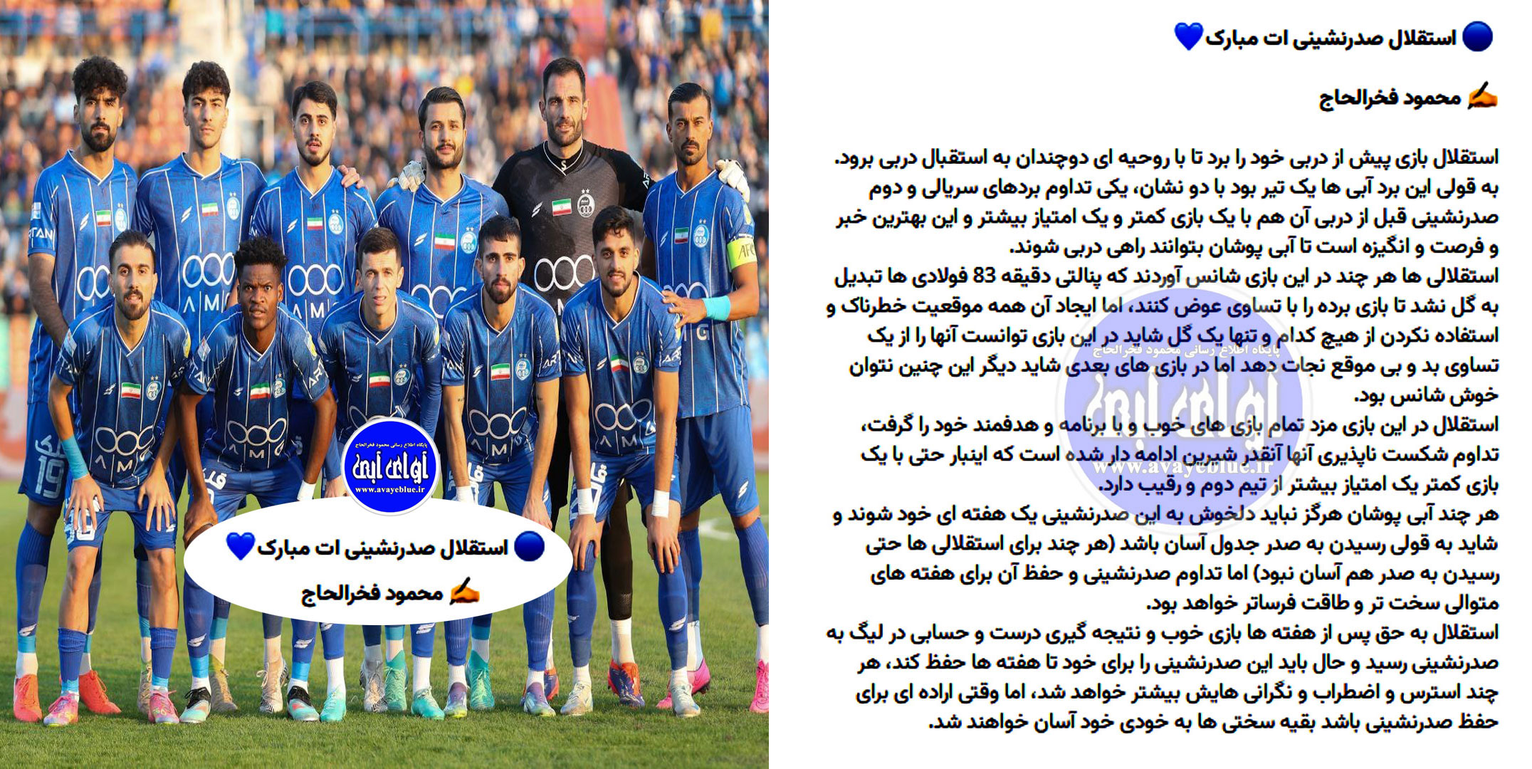 هر چند آبی پوشان هرگز نباید دلخوش به این صدرنشینی یک هفته ای خود شوند و شاید به قولی رسیدن به صدر جدول آسان باشد (هر چند برای استقلالی ها حتی رسیدن به صدر هم آسان نبود) اما تداوم صدرنشینی و حفظ آن برای هفته های متوالی سخت تر و طاقت فرساتر خواهد بود.